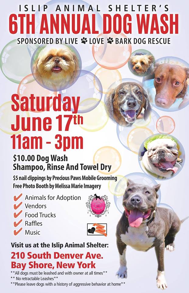 It’s that time again! We’re holding our 6th annual dog wash on Saturday, June 17th from 11am to 3pm at our shelter. For a $10 donation, we’ll shampoo, rinse and towel dry your pup! We’re happy to be able to offer nail trimming also this year for an additional $5.00 donation. Nail trimmings courtesy of Precious Paws Mobile Grooming -Suffolk County.